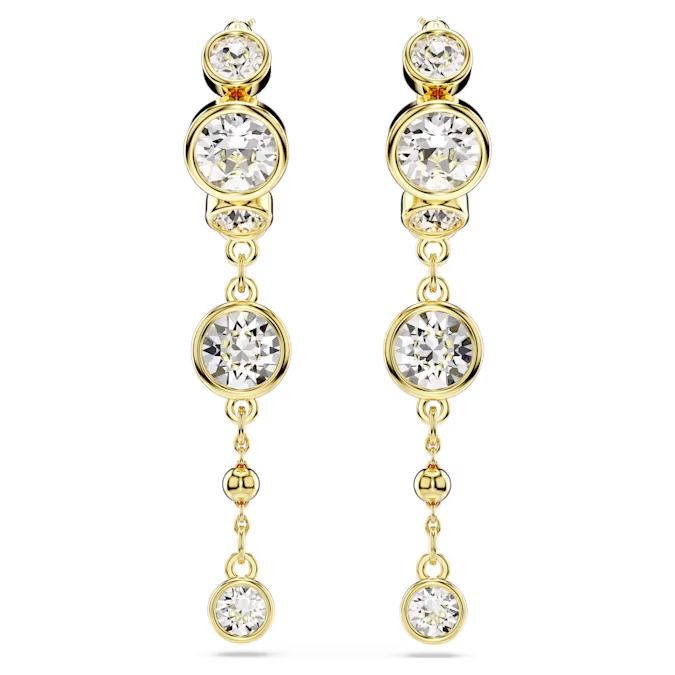 Kreirane da prate pokret i hvataju svetlost, ove minđuše predstavljaju upečatljiv način da podignete svaki stajling. Svaki komad presvučen zlatnim tonom ima mini obruč sa uklonjivim visećim lancem, ukrašenim okruglim kristalima u podignutom bezel ležištu i sjajnom metalnom kapljicom. Svestran izbor za one koji vole da se izdvoje iz mase.
