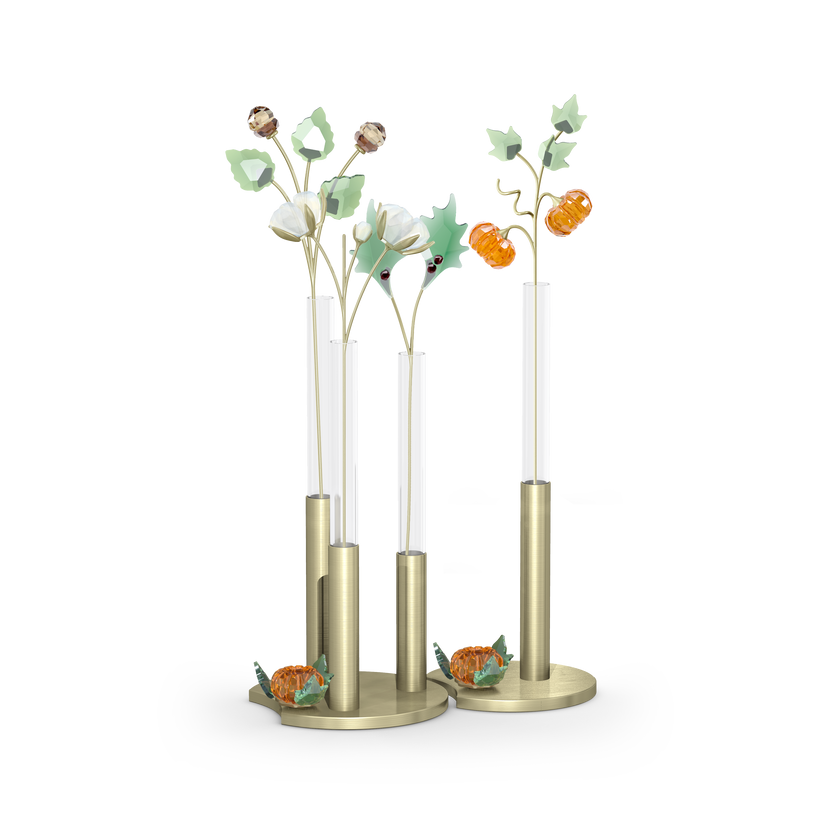 Unesite poseban šarm u svoj dom sa ovim prelepim kristalnim delom koje prikazuje grančicu dekorativnog drveta bundeve. Plodovi, koji podsećaju na minijaturne bundeve i simbolizuju plodnost i dug život, inspirisani su minimalističkim trendom vaza sa jednim stabljikom. Blistajući u 268 faseta narandžastog i zelenog kristala, listovi i plodovi se prelepo uklapaju sa toplim tonovima i nežnim linijama stabljike od brušenog metala u šampanj-zlatnoj završnici, uz zakrivljene vitice. Ovaj prelep poklon, pun modernog stila, može se postaviti u malu ili veliku Garden Tales dekorativnu vazu, unoseći suptilnu sezonsku eleganciju u svaki dom.