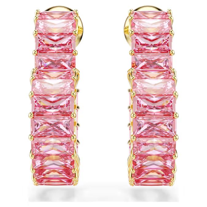 Zaljubite se u ove romantične minđuše u obliku srca koje predstavljaju moderan i blistav preokret klasičnih "alki" (hoops). Dizajn sa pozlatom u zlatnom tonu u potpunosti je ukrašen jarkoružičastim Swarovski cirkonijama u specifičnom baguette rezu. Ova kombinacija smele boje i sofisticiranog pravougaonog reza kamenčića čini ih savršenim izborom za one koji žele da spoje romantiku i savremeni stil.