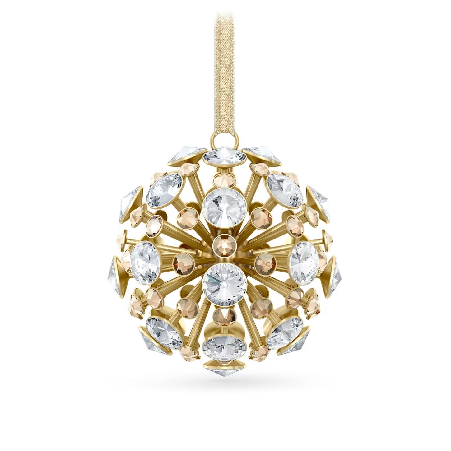 Osvetlite svoje praznične dekoracije ovom spektakularnom kuglom na traci u zlatnoj lamé završnici. Inspirisana geometrijskim izgledom naše Constella kolekcije nakita, kombinuje tople, bezvremenske boje sa inovativnom 3D siluetom. Eksplozija od 85 kristala u prozirnoj i zlatnoj boji, sa ukupno 1.936 faseta, blista u postavama od brušenog metala u šampanj-zlatnoj završnici. Sjajna ideja za poklon ili luksuzan detalj u vašem prazničnom dekoru.