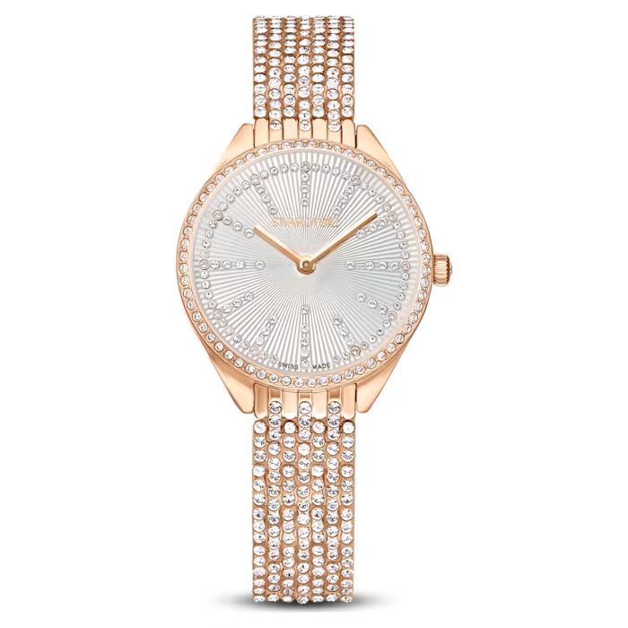 Model 5644053 iz prestižne Attract serije predstavlja vrhunac dress watch stila. Ovaj sat spaja toplinu ružičastog zlata sa hladnim sjajem kristala, kreirajući komad koji na zglobu izgleda poput najfinijeg nakita.Okvir kućišta i srebrni brojčanik optočeni su kristalnim markerima, dok je narukvica od hirurškog čelika sa PVD premazom u tonu ružičastog zlata pravi dizajnerski poduhvat – gusto postavljeni nizovi kristala pružaju teksturu koja reflektuje svetlost iz svakog ugla. Sa prečnikom od 30 mm, ovo je sat koji odiše ženstvenošću i švajcarskom preciznošću.
