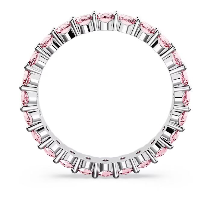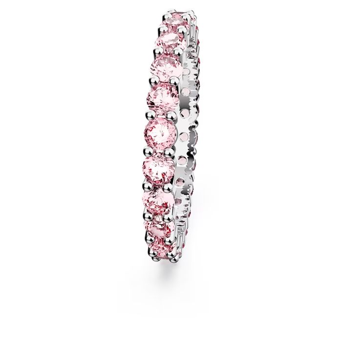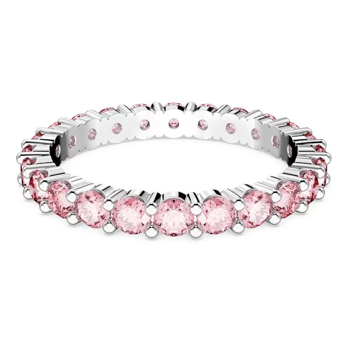 Dizajniran da privlači poglede, ovaj prsten krase blistave Swarovski cirkonije u specifičnoj, intenzivnoj purpurno-roze nijansi. Kamenje je raspoređeno duž celog obruča, dok rodijumska završna obrada svojim hladnim srebrnim sjajem pruža savršen kontrast toplini roze tonova. Njegova forma je moderna i razigrana, pružajući vam priliku da kreirate sopstvenu „dugu“ na prstima.