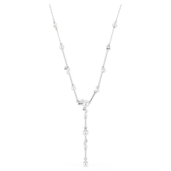 Ova ogrlica predstavlja pravo malo remek-delo dizajna gde se prepliću Swarovski cirkonije različitih veličina i snežno beli kristalni biseri. Zahvaljujući specifičnom načinu postavljanja na tanke metalne šipke sa rodijumskom završnom obradom, kamenčići deluju kao da lebde, dok dugački centralni niz dodaje dramatičan efekat „zvezdane prašine“. Podesiva kopča omogućava da ogrlica savršeno prati liniju vašeg vrata, donoseći sjaj zvezda u svaku priliku.