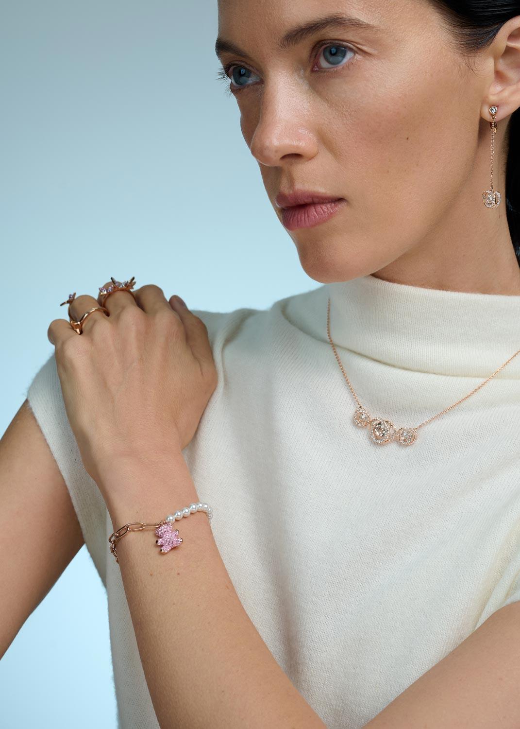 Ko kaže da omiljeni simboli detinjstva ne mogu biti deo vrhunskog stila? Ova neodoljiva Teddy narukvica transformiše motiv plišanog medvedića u luksuzni komad nakita koji prosto zrači toplinom. Centralni motiv medvedića u potpunosti je prekriven blistavim Pink Crystals kamenčićima, čineći ga glavnom zvezdom vašeg zgloba.Ovaj kontrast belih bisera i toplog roze zlata čini je komadom koji se ne zaboravlja.