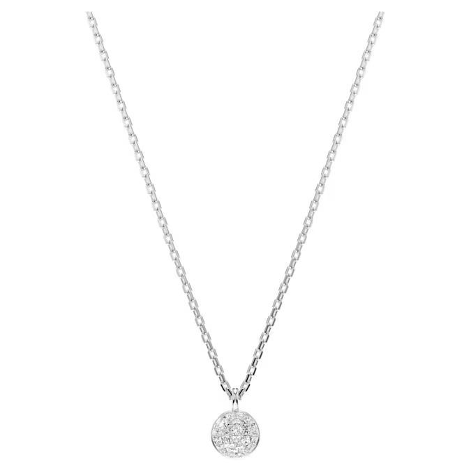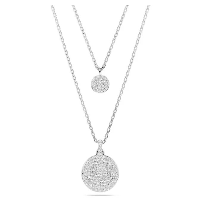 Ovaj blistavi slojeviti privesak je idealan način da svoj stil ispunite svetlošću. Dizajn sa završnom obradom od rodijuma čine dva lančića, od kojih svaki nosi ispupčeni motiv meteora koji je prelepo ukrašen „snow pavé“ tehnikom sa prozirnim okruglim kristalima različitih veličina. Za dodatnu svestranost, privesak se može okrenuti, otkrivajući oreol od kristala oko većeg motiva i jedan kristal u samom centru.