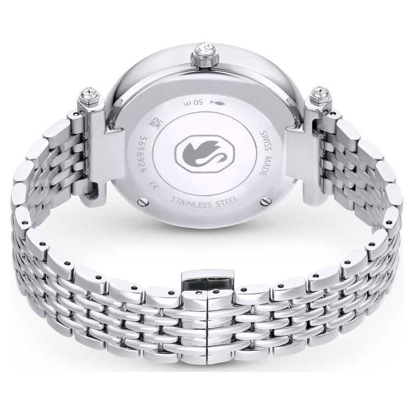 Ovaj prefinjeni sat iz Crystalline porodice umetnički spaja formu i funkcionalnost u svom najčistijem obliku. Kućište od nerđajućeg čelika ispunjeno je sa oko 1.000 blistavih prozirnih kristala koji stvaraju neverovatan efekat sjaja pri svakom pokretu. Elegantni beli brojčanik krasi prepoznatljivi Swarovski labud na poziciji 12 sati i arapski brojevi, dok narukvica od visokokvalitetnog čelika upotpunjuje ovaj sofisticirani, monohromatski dizajn. Kao spoj švajcarske preciznosti i vrhunskog glamura, ovaj srebrni model je idealan za dame koje preferiraju klasičan i hladniji ton nakita.