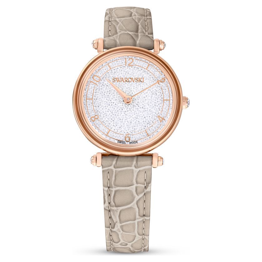 Ovaj očaravajući sat iz Crystalline kolekcije predstavlja savršen spoj luksuza i funkcionalnosti. Kućište u boji ružičastog zlata (rose gold) čuva brojčanik ispunjen sa oko 1000 blistavih kristala, stvarajući neverovatan svetlosni efekat pod zaobljenim staklom. Elegantni bež kaiš od italijanske teleće kože sa šarom guštera i švajcarski mehanizam čine ovaj sat vrhunskim modnim dodatkom za svakodnevnu eleganciju ili dragocen poklon voljenoj osobi.