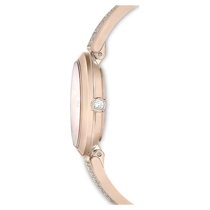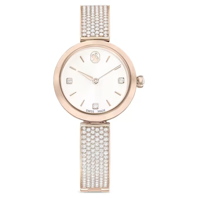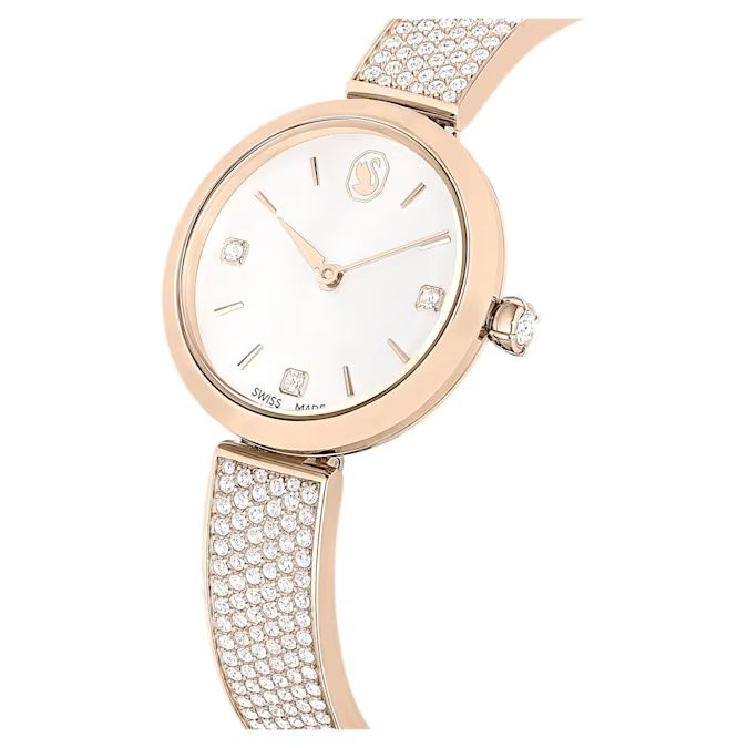 Satovi iz kolekcije Illumina dizajnirani su da budu više od merača vremena – oni su senzacionalan nakit za vaš zglob. Ovaj model prečnika 27 mm dolazi u prefinjenoj završnoj obradi od šampanj-zlata, sa podesivom narukvicom koja je gusto ukrašena sa 210 prozirnih kristala.Ispod mineralnog stakla nalazi se elegantni "sunray" brojčanik sa logotipom labuda na poziciji 12 sati i tri kvadratna kristala koji služe kao markeri. Sa jednim kristalom ugrađenim u krunicu i vrhunskom švajcarskom preciznošću, ovaj sat je stvoren da zrači svetlošću u svakom trenutku dana ili noći.