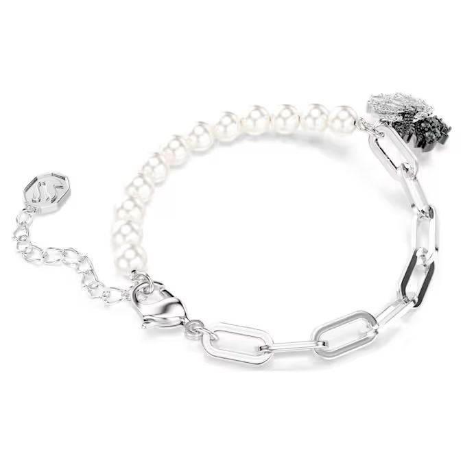 Idealna za izražavanje ličnog stila, ova zadivljujuća narukvica podeljena je između delikatnog lanca i niza belih Swarovski Crystal Pearls (kristalnih bisera), sa elegantnim motivom labuda koji visi u samom centru.Ovaj kultni amblem prikazuje dva isprepletana labuda u kombinaciji rodijumske i rutenijumske prevlake, ukrašena crnim i belim Swarovski Zirconia kamenjem u okruglim i marquise rezovima. Savršena polazna tačka za kreiranje vašeg personalizovanog stila.
