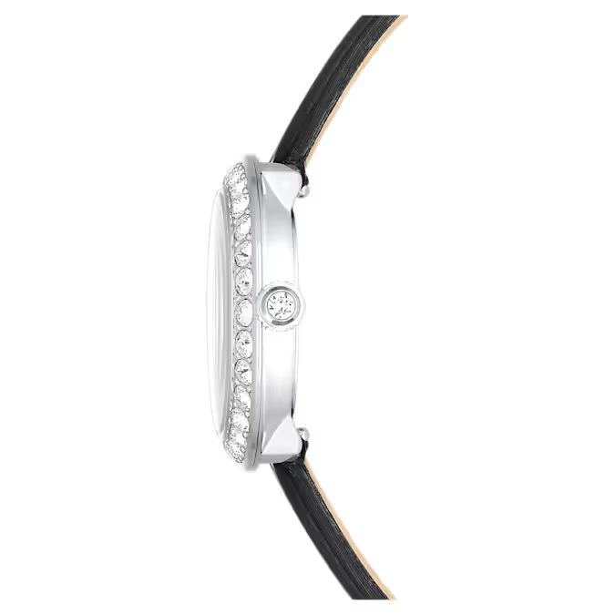 Oslanjajući se na ikoničnu formu Matrix Tennis nakita, ovaj sat ostavlja snažan utisak elegancije i sjaja. Kućište od nerđajućeg čelika promera 30 mm krase 30 prozirnih kristala u pavé postavci na prstenu (bezelu), dok je crni brojčanik sa „sunray“ efektom dodatno naglašen kristalnim markerima za sate i prepoznatljivim logotipom labuda na poziciji 12 sati.Ovaj sat je savršen spoj funkcionalnosti i luksuznog nakita. Crni kožni kaiš sa satenskim sjajem daje mu dozu prefinjenosti koja se lako uklapa uz poslovne, ali i večernje prilike. Za potpuno zaokružen i besprekoran izgled, nosite ga uz narukvice ili prstenje iz Matrix Tennis porodice.
