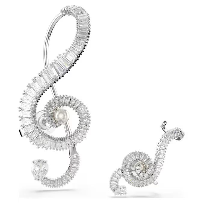 Ove asimetrične minđuše na klip, inspirisane svetom muzike, unose ritam i svetlost u svaku odevnu kombinaciju. Dizajnirane u obliku violinskog ključa u dve različite veličine, ove minđuše sa rodijumskom prevlakom su elegantno sužene i optočene Swarovski Zirconia kamenjem u „baguette“ rezu. Za dodatnu dozu čiste „zvezdane energije“, u samom centru svakog komada postavljen je po jedan Swarovski kristalni biser. Poklonite ih talentovanoj muzičarki ili ih nosite kako bi vaše srce zapevalo.