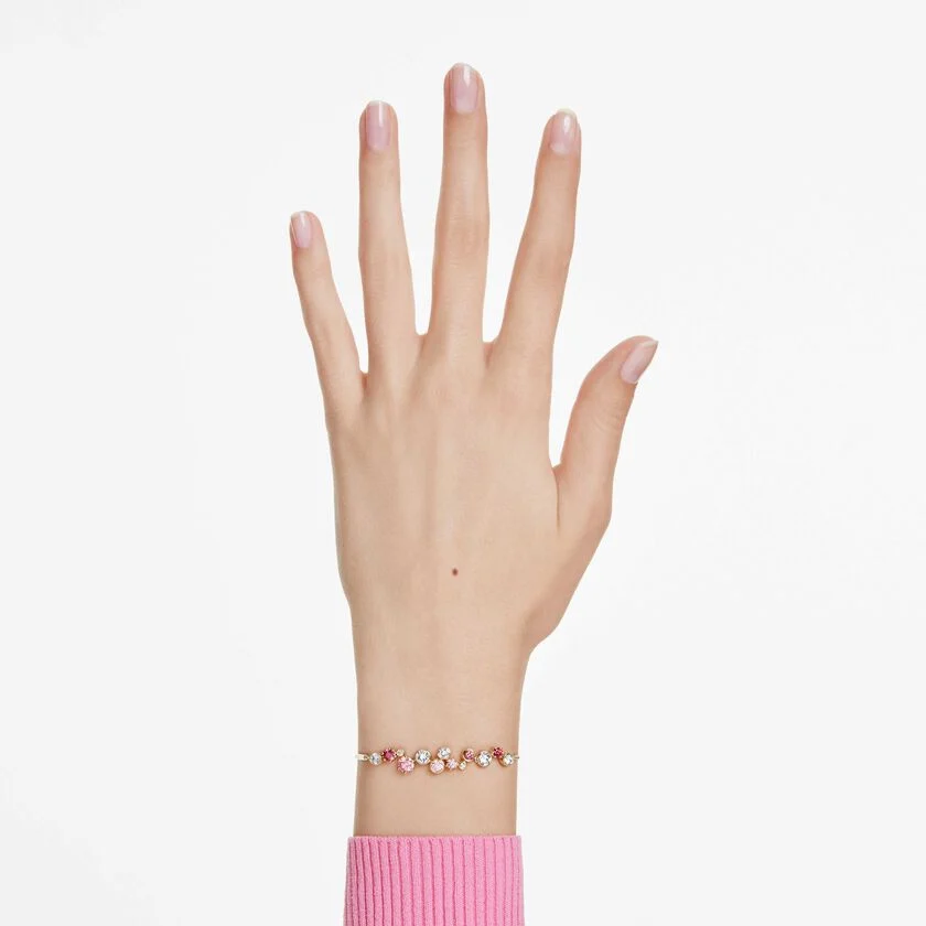 Istaknite svoju razigranu stranu uz ovu toplu i radosnu Constella narukvicu. Dizajn sa pozlatom u tonu zlata karakterišu čvrste metalne pločice i nežni lančić, ukrašeni prozirnim kristalima i Swarovski Zirconia kamenjem u različitim veličinama. Živopisna mešavina crvenih i ružičastih nijansi daje narukvici očaravajući izgled, dok klizna kopča omogućava lako podešavanje savršene dužine.Ova narukvica unosi energiju i boju u svakodnevni stil. Zbog svog podesivog dizajna, veoma je udobna za nošenje i lako se kombinuje sa drugim narukvicama, ali najbolje sija kada se upari sa minđušama u sličnim toplim tonovima.