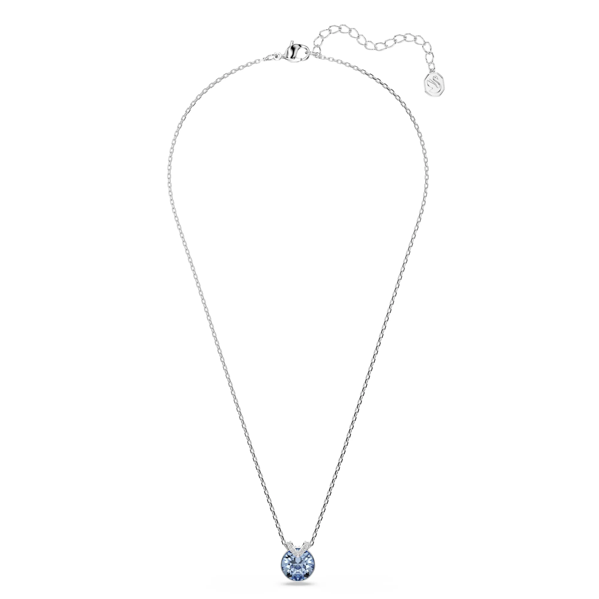 Ovaj blistavi privezak u obliku slova V pleni pažnju svojim centralnim svetloplavim kristalom postavljenim na rodijumsku podlogu. Dodatni sloj lepote pruža suptilni pavé niz svetlucavih kristala koji uokviruju centralni kamen, dok nežni lančić odiše čistom elegancijom. Dizajn koji spaja klasičan stil i osvežavajuću boju čini ga idealnim izborom za svaku priliku.