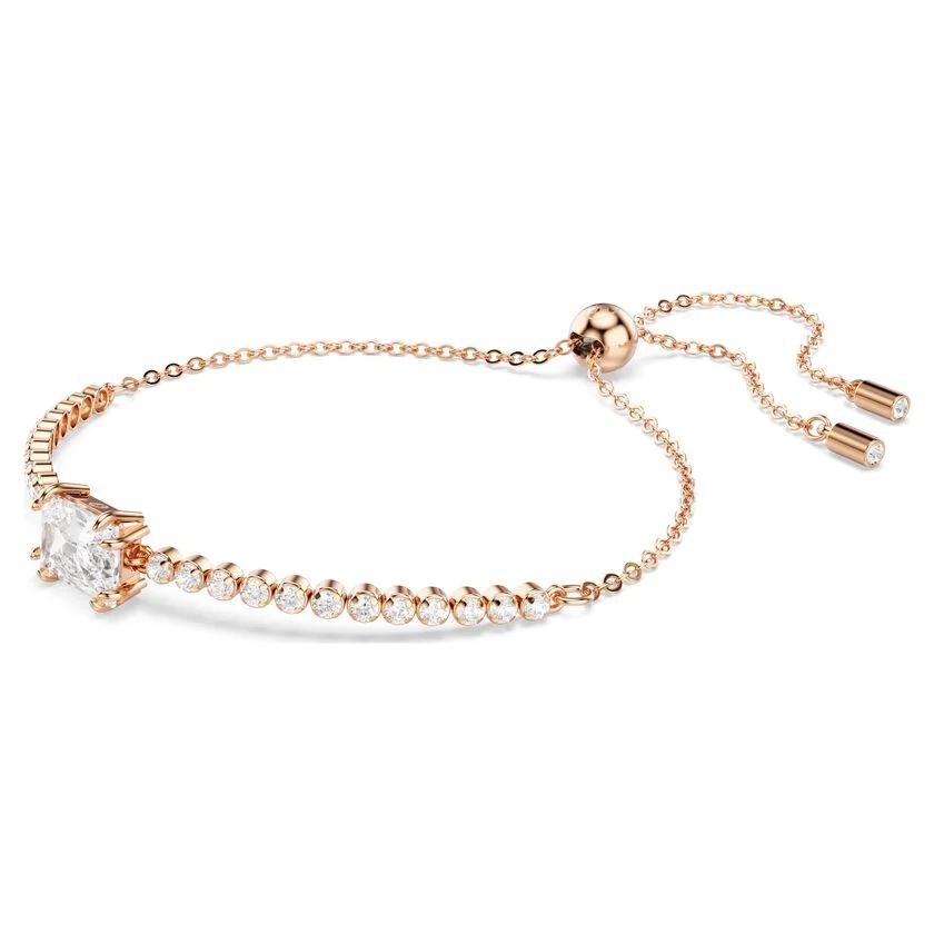 Dodajte dašak radijacije svakom izgledu uz ovu modernu interpretaciju vanvremenskog stila. Narukvica je izrađena sa luksuznom pozlatom u tonu ružičastog zlata i karakteriše je ujednačen niz prozirnih Swarovski Zirconia elemenata.Poseban vizuelni akcenat daje centralni cirkon u baguette rezu, koji razbija klasičnu formu i unosi vibrantan preokret u ovaj prepoznatljivi dizajn. Zahvaljujući podesivom kliznom zatvaranju, narukvica savršeno pristaje svakom zglobu, čineći je idealnim izborom za svakodnevni luksuz.