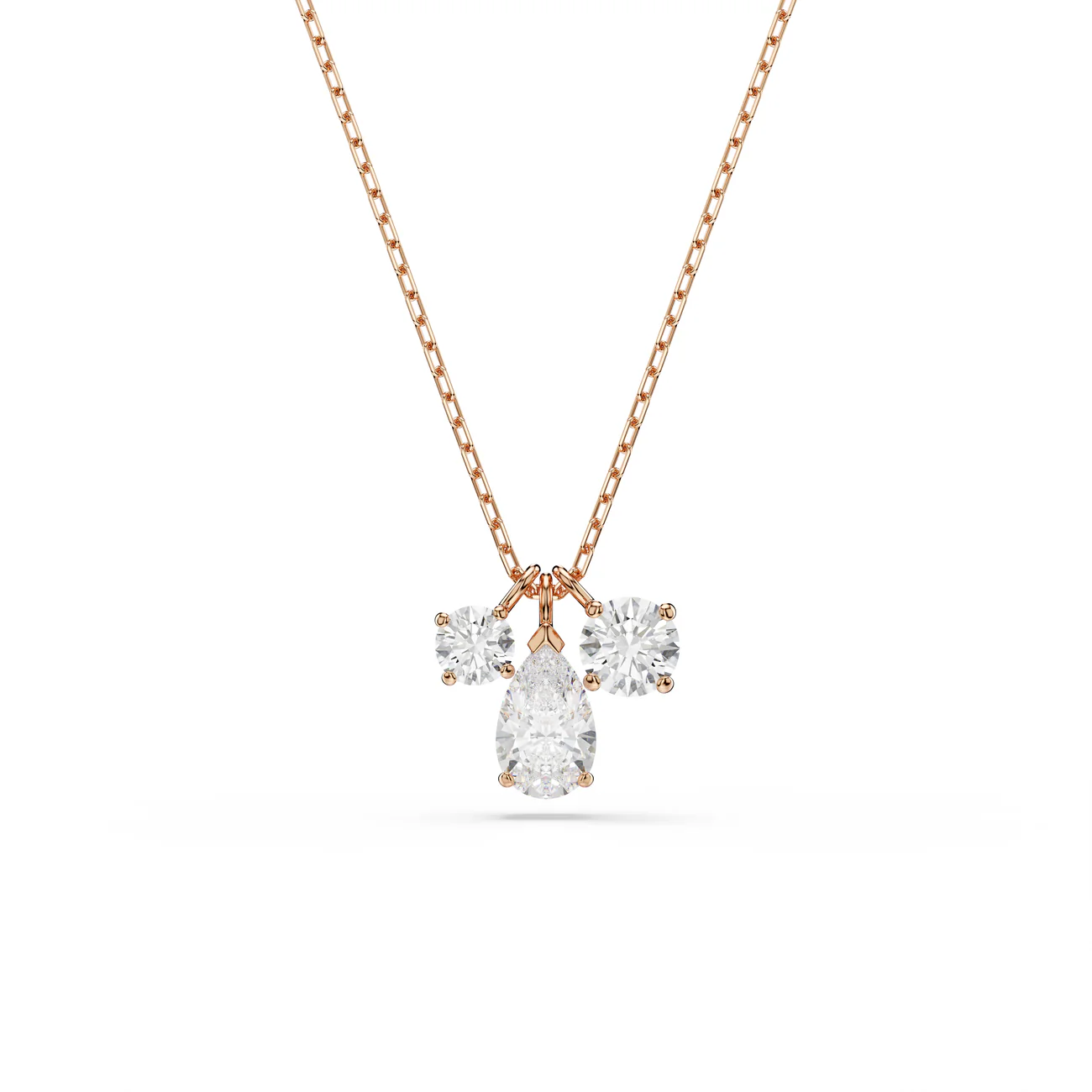 Ovaj elegantni privezak iz porodice Mesmera Attract spaja vrhunsku izradu i minimalistički dizajn. Centralni kamen u obliku suze (pear-cut) uokviren je sa dva manja okrugla cirkona, stvarajući prefinjen trostruki sjaj. Sa toplom pozlatom u tonu ružičastog zlata, savršen je izbor za diskretan luksuz koji se lako uklapa u svaki dan.
