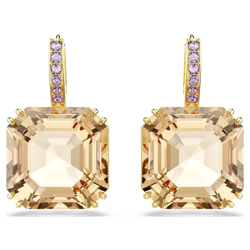 Ove minđuše donose prefinjen stil kroz tople tonove. Glavni ukras je kristal u boji karamele, sečen u kvadratni oblik sa stepenastim ivicama (Asscher rez), koji drže dvostruke metalne nožice. Poseban detalj je gornji deo (kopča) koji je ukrašen sitnim ljubičastim kristalima, dajući celom dizajnu dodatni sjaj i moderan kontrast.