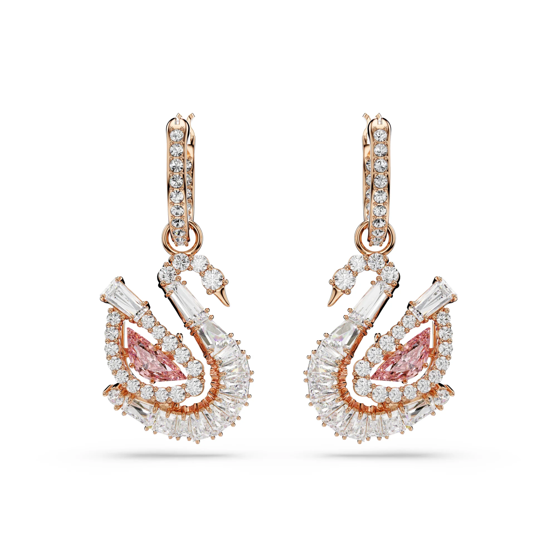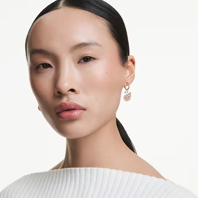Osetite delikatnu pokretljivost legendarnog Swarovski labuda kroz ove amblematične minđuše. Svaka figura labuda visi sa male alke ukrašene svetlucavim pavé nizom, dok je osnova izrađena sa prefinjenom pozlatom u tonu ružičastog zlata. Poseban akcenat je na ružičastom "dancing stone" kristalu unutar tela labuda, koji se neprestano pokreće, stvarajući igru svetlosti i boja pri svakom vašem koraku.