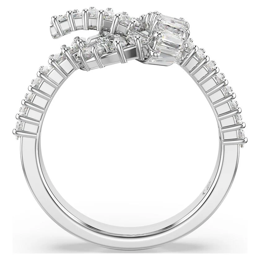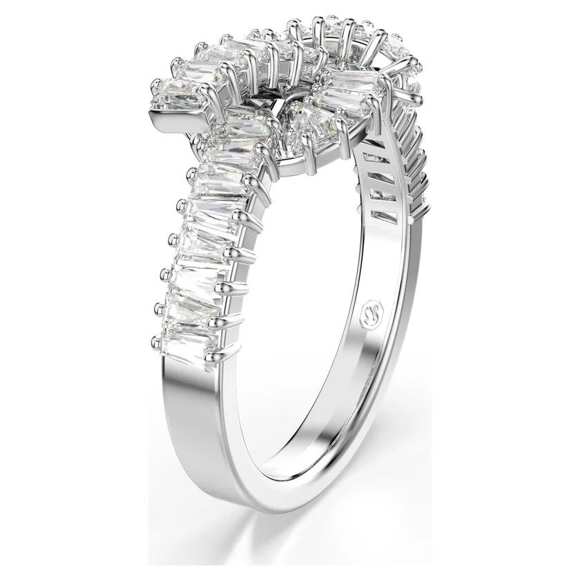 Pružite svom stilu blistavi preokret uz ovaj elegantni Matrix prsten. Dizajniran u obliku prefinjenog čvora koji podseća na svilenu traku, ovaj komad sa rodijumskom prevlakom krasi niz baguette-cut Swarovski Zirconia kamenja. Svaki kamen je pažljivo postavljen u „prong“ ležište, čime se postiže maksimalna refleksija svetlosti. Moderan i umetnički, ovaj prsten je pravo malo remek-delo na vašoj ruci.Zahvaljujući svom skulpturalnom obliku, ovaj prsten je dovoljno efektan da se nosi samostalno, ali se savršeno uklapa i uz Matrix minđuše (šifra 5733397).
