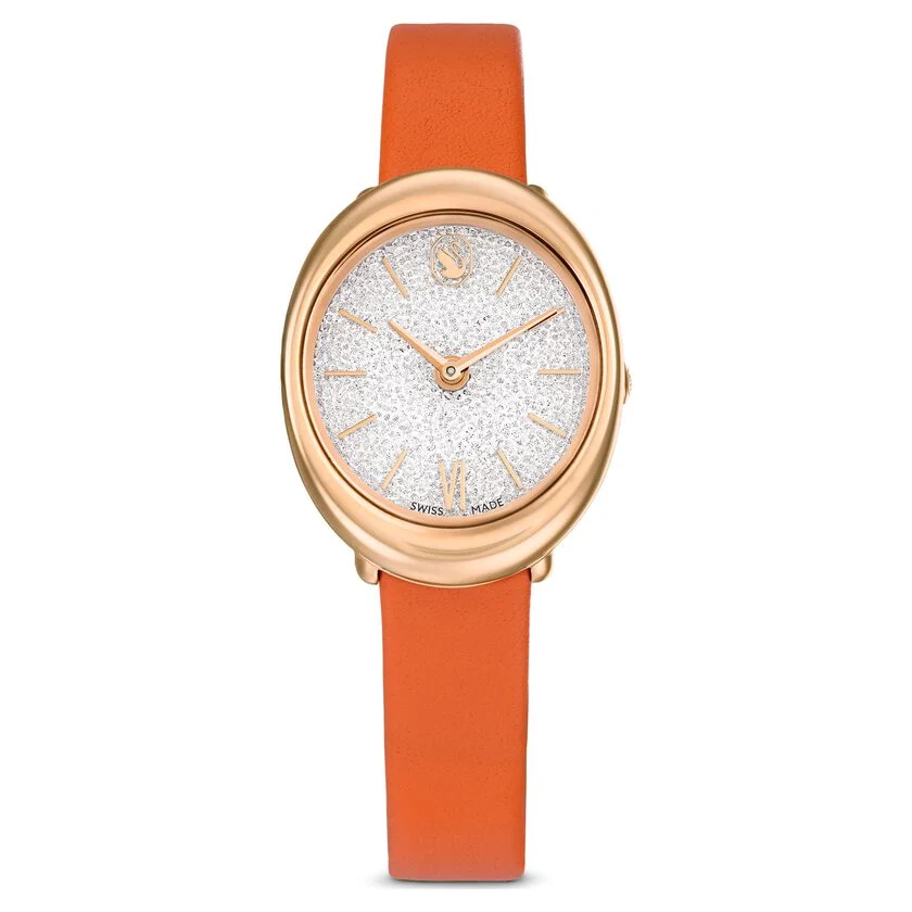 Otkrijte savršen spoj švajcarske preciznosti i smelog dizajna. Ovaj Swiss Made časovnik zadržava prepoznatljivu eliptičnu formu, ali je osvežen kožnim kaišem u upečatljivoj narandžastoj boji, što ga čini idealnim statement komadom za žene koje vole da se istaknu. Unutrašnjost sata krije čuveni Crystalline brojčanik sa oko 1000 kristala, dok kućište sa PVD premazom u tonu ružičastog zlata pruža toplu i luksuznu završnicu. Elegantni detalji, poput rimskog broja na poziciji 6 sati i logotipa labuda, čine ovaj sat modernim klasikom koji podiže svaku odevnu kombinaciju.
