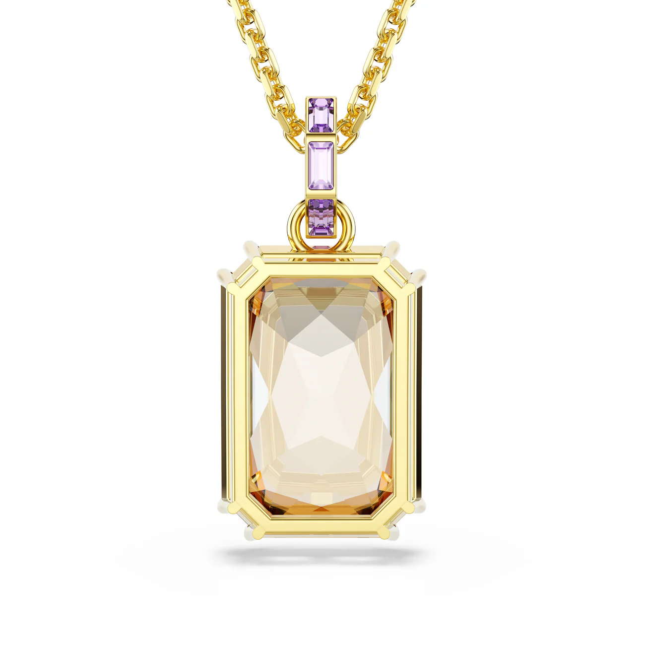 Ovaj blistavi Millenia privezak odiše toplinom i luksuzom. Centralni motiv čini krupni kristal u boji karamele, postavljen u elegantne duple krunice, dok je spojnica sa lančićem ukrašena ljubičastim kristalima u channel postavci.