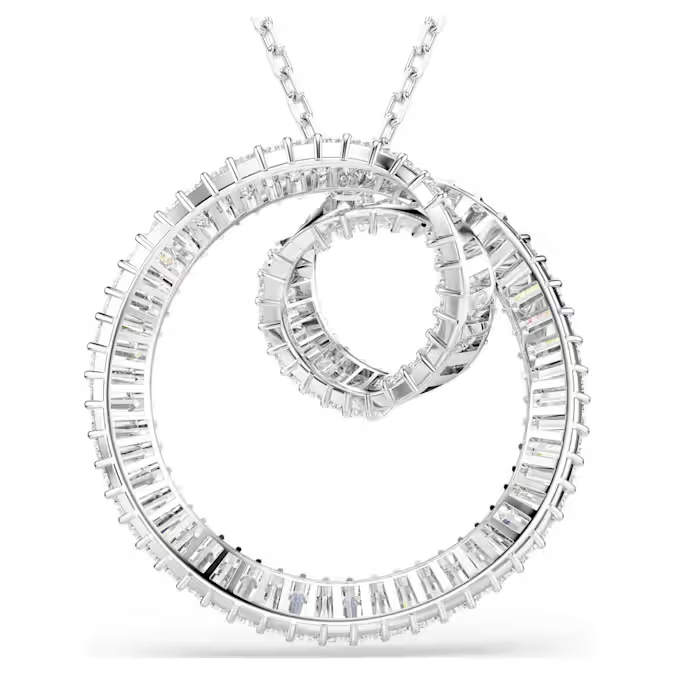 U dramatičnom kovitlacu svetlosti, ovaj Matrix privezak kombinuje klasičnu rodijumsku prevlaku sa blistavim Swarovski Zirconia kamenjem. Centralni motiv, okačen na dugačak lančić, prikazuje elegantnu uvijenu traku ukrašenu punim nizom cirkona u baget (baguette) rezu.