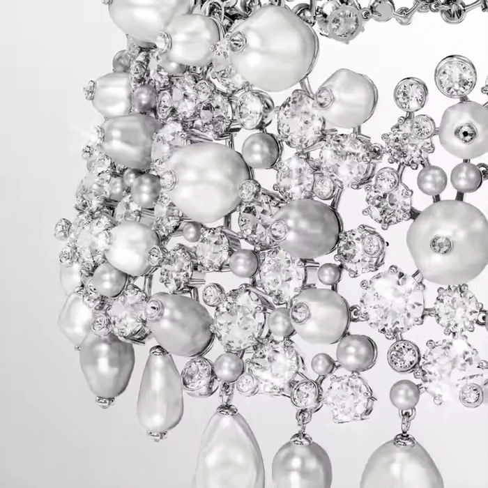 Blistav i ekspresivan, ovaj Constella čoker je savršen izbor za posebne prilike. Dizajn sa rodijumskom završnom obradom kombinuje prozirne kristale različitih veličina sa belim i sivim Swarovski Crystal Pearls biserima, kreirajući sofisticiran i luksuzan izgled.