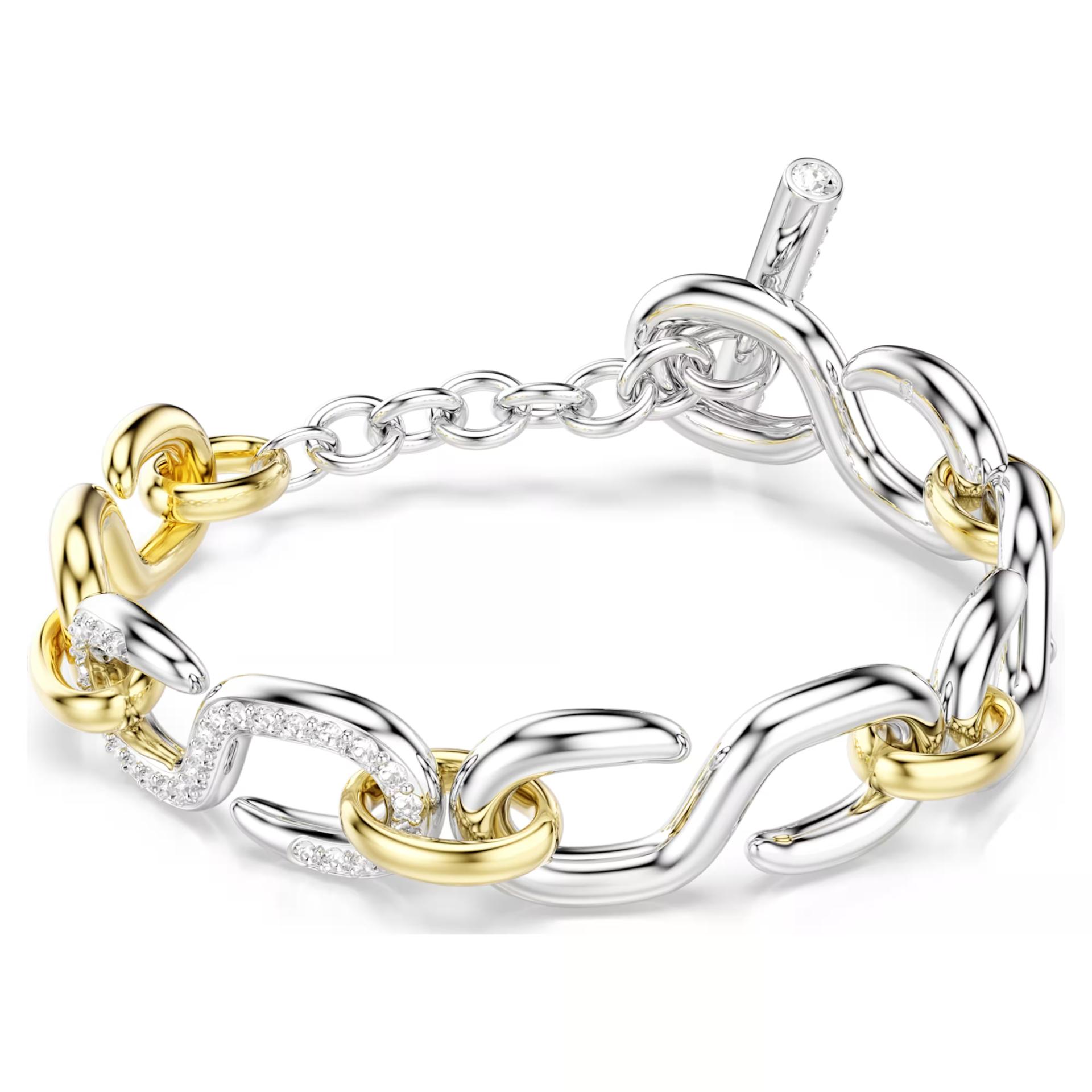 Dextera – Narukvica sa kontrastom metala Ova Swarovski narukvica otelotvoruje prepoznatljiv industrijski stil Dextera kolekcije kroz igru kontrasta. Dizajn karakterišu naizmenične karike sa pozlatom u tonu zlata i rodijuma, dok je centralni bar element optočen prozirnim kristalima za maksimalan sjaj. Moćan i upečatljiv komad koji se savršeno kombinuje sa drugim nakitom oštrih silueta.