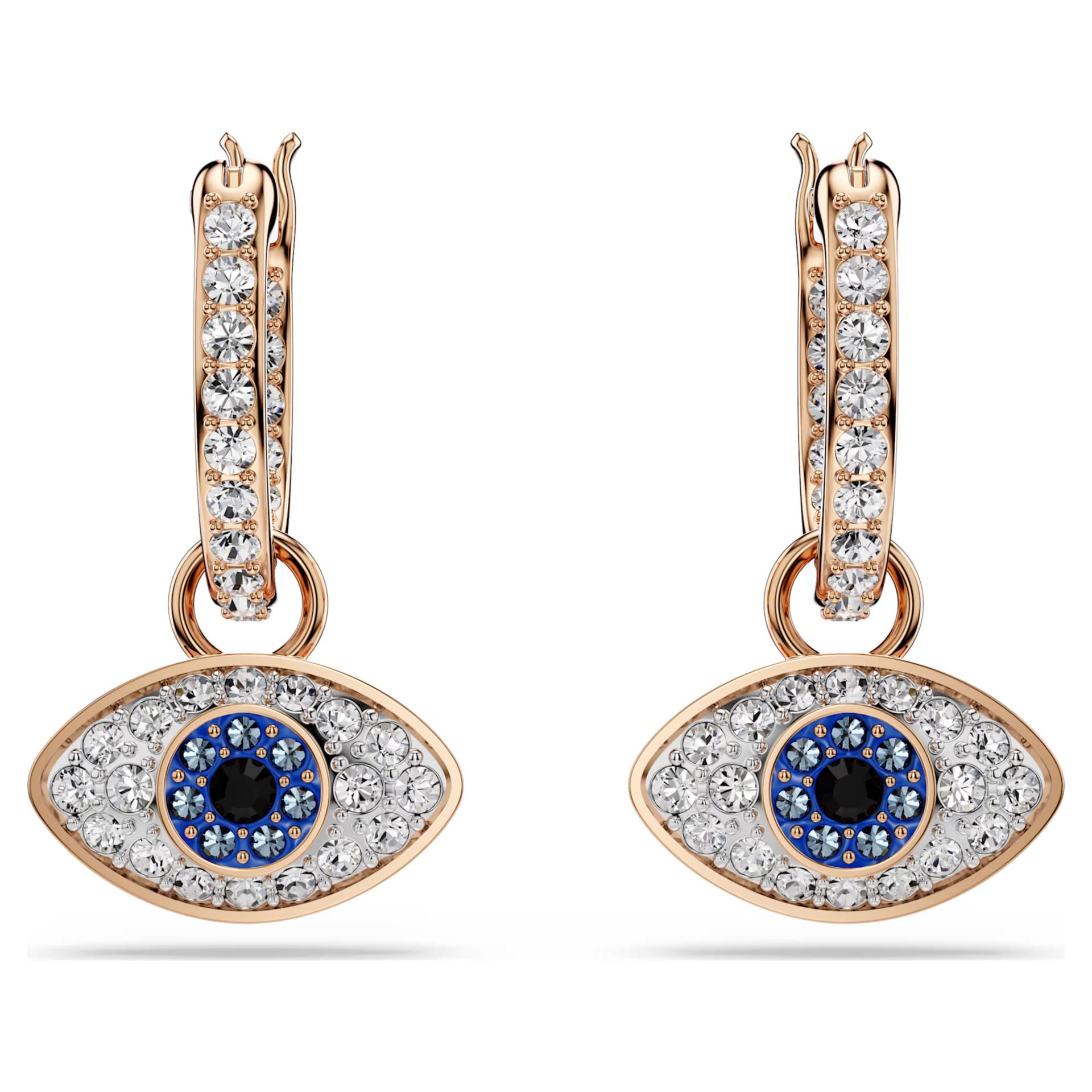 Symbolica – Evil Eye viseće minđuše Povežite se sa svojom duhovnom stranom uz ove minđuše u tonu ružičastog zlata. Sa klasičnih pavé alki vise motivi "zlog oka" (talisman za zaštitu), ukrašeni prozirnim, plavim i crnim kristalima. Ova moderna interpretacija tradicionalnog simbola unosi dašak mističnog glamura u svaku odevnu kombinaciju.