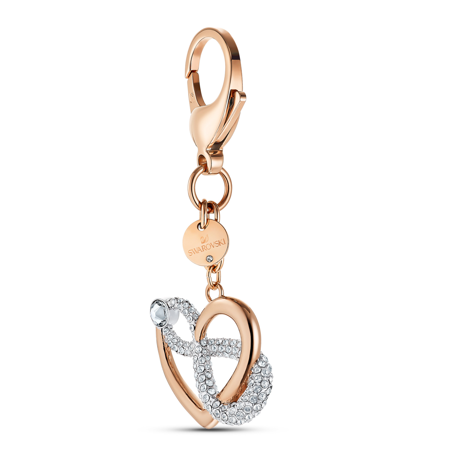 Umetnost večne ljubavi. Ovaj romantični privesak za torbu brenda Swarovski vešto kombinuje srce sa pozlatom u nijansi ružičastog zlata i simbol beskonačnosti sa završnom obradom od rodijuma. Ekspresivan dizajn upotpunjen je svetlucavim Swarovski kristalom postavljenim na mestu gde se ova dva elementa spajaju. Opremljen karabinjer kopčom, ovaj aksesoar se može koristiti kao ukras za torbu ili kao privezak za ključeve. Predivan sam po sebi, može se zakačiti i na romantičan poklon za neku posebnu osobu.