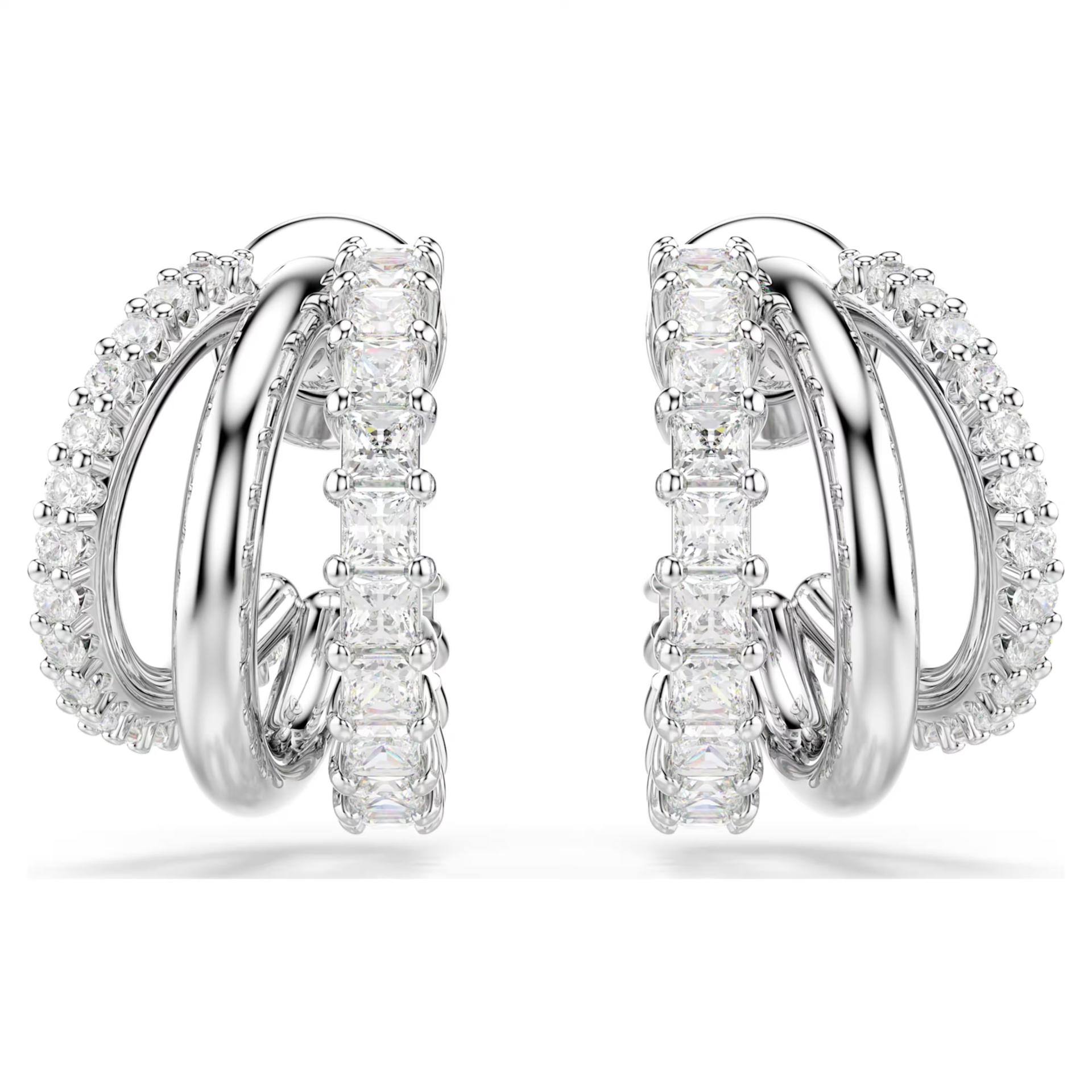 Ove precizno izrađene Hyperbola minđuše odišu jedinstvenom lepotom. Sa svake strane nalaze se po tri mini alke sa rodijumskom prevlakom, ukrašene Swarovski cirkonima okruglog i kvadratnog reza u „prong“ (krunskom) okruženju. Kombinujte ih sa odgovarajućom čvrstom narukvicom ili priveskom za izgled koji ostavlja bez daha.Prong setting se naziva krunski okov ili postavka sa zupcima, gde metalni „zupci“ drže kristal na mestu, omogućavajući svetlosti da mu pristupi sa svih strana za maksimalan sjaj.