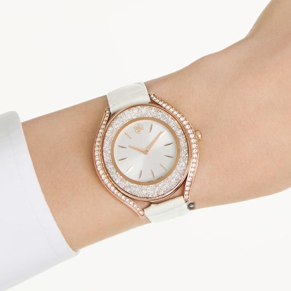 Ovaj sat nije samo instrument za merenje vremena, već komad čistog luksuza na zglobu. Prepoznatljiva Crystalline estetika donosi kućište ispunjeno sa preko 1.380 blistavih kristala, postavljenih u okvir sa završnom obradom od ružičastog zlata.Sofisticiranost je u detaljima: beli kožni kaiš i srebrni sunray brojčanik čine savršen kontrast, dok Swarovski labud na poziciji 12 sati diskretno potvrđuje autentičnost i prestiž. Spoj švajcarske preciznosti i vrhunskog dizajna, stvoren za one koji biraju besprekornost.