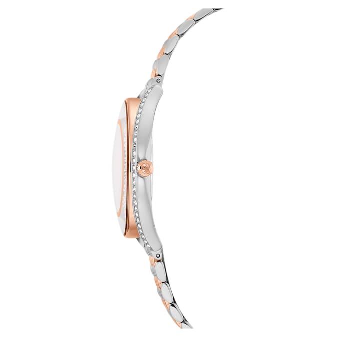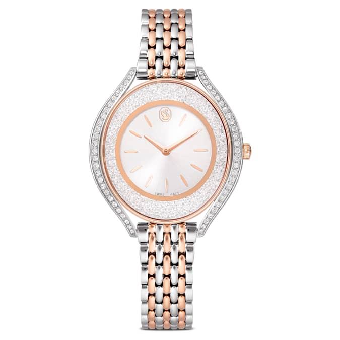 Ovaj prefinjeni Crystalline sat umetnički spaja eleganciju i funkcionalnost kroz moderan dvobojni dizajn. Oko kućišta, koje kombinuje nerđajući čelik i završnu obradu u roze-zlatnom tonu, utkano je približno 1.380 blistavih kristala. Sofisticirani izgled upotpunjen je metalnom narukvicom, srebrnim brojčanikom sa efektom sunčevih zraka i prepoznatljivim Swarovski labudom na poziciji 12 sati. Ovaj sat švajcarske proizvodnje (Swiss made) je vodootporan do 50 m.