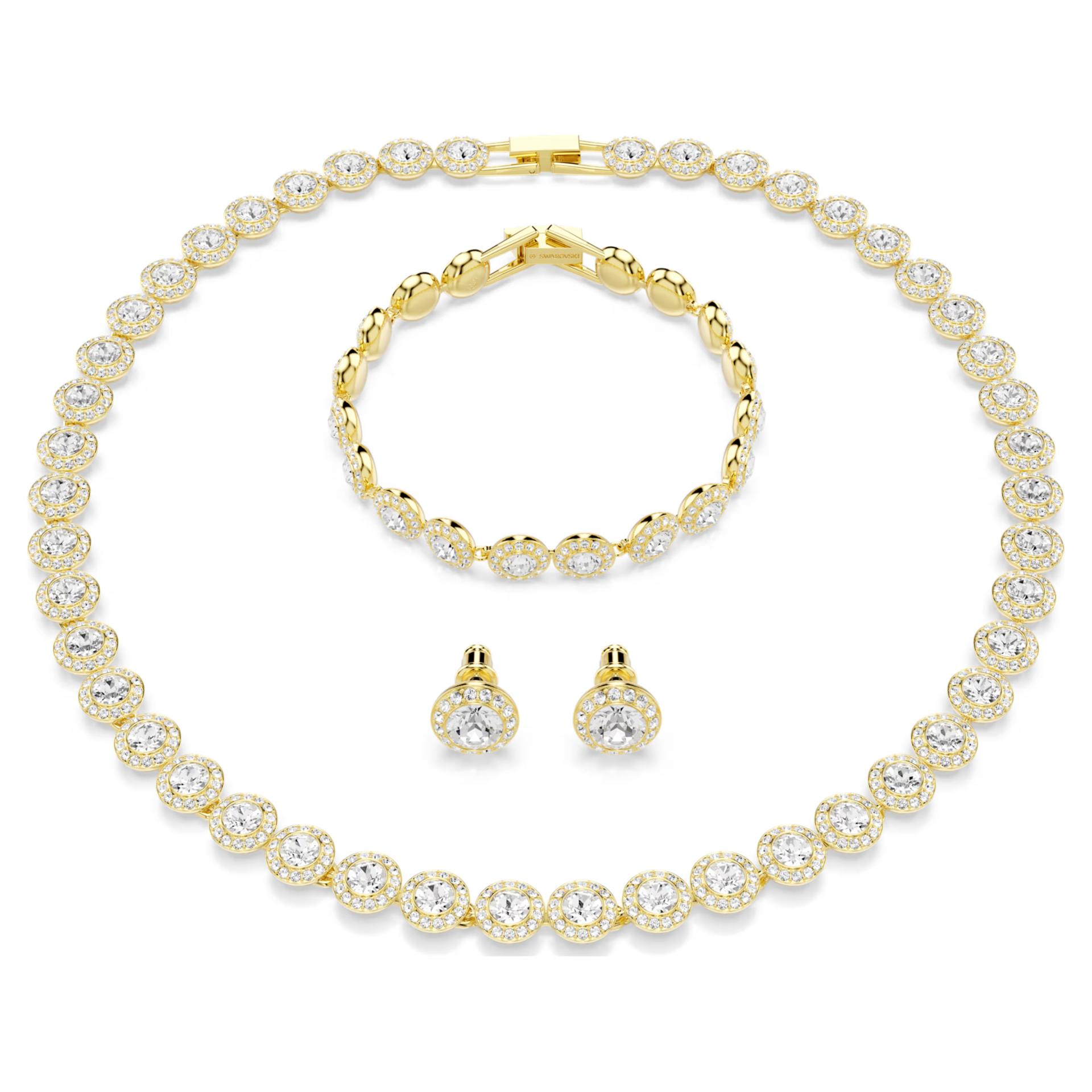 Obradujte sebe ili dragu osobu ovim veličanstvenim setom koji čine ogrlica, minđuše i narukvica. Dizajniran da traje, ovaj komplet kombinuje blistave prozirne kristale sa toplom pozlatom u boji zlata. Bezvremenska elegancija ovih komada čini ih savršenim izborom za svakodnevni luksuz, ali i kao sofisticiran aksesoar za mlade (bridal jewelry).Ogrlica i narukvica imaju mogućnost finog podešavanja dužine.