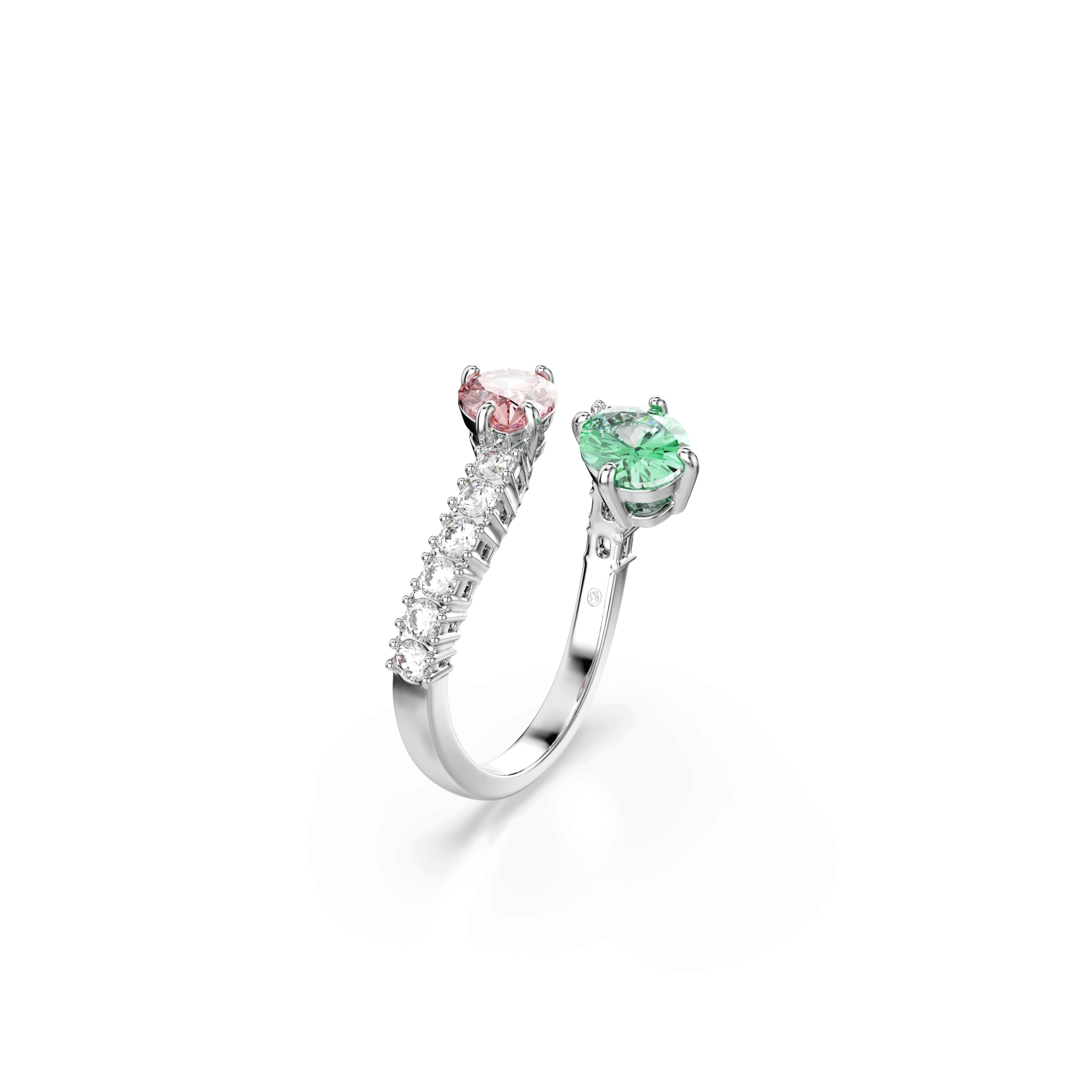 Magične boje i nežan stil spojeni su u ovom razigranom prstenu. Otvorena traka je rodijumom presvučena i ukrašena prozirnim Swarovski Zirconia kamenčićima, dok su na krajevima postavljena dva Swarovski Zirconia kamena u pastelnim bojama – zeleni ovalni i ružičasti u obliku suze. Kombinujte ovaj prsten sa odgovarajućim komadima nakita iz iste kolekcije za razigran i skladan izgled.