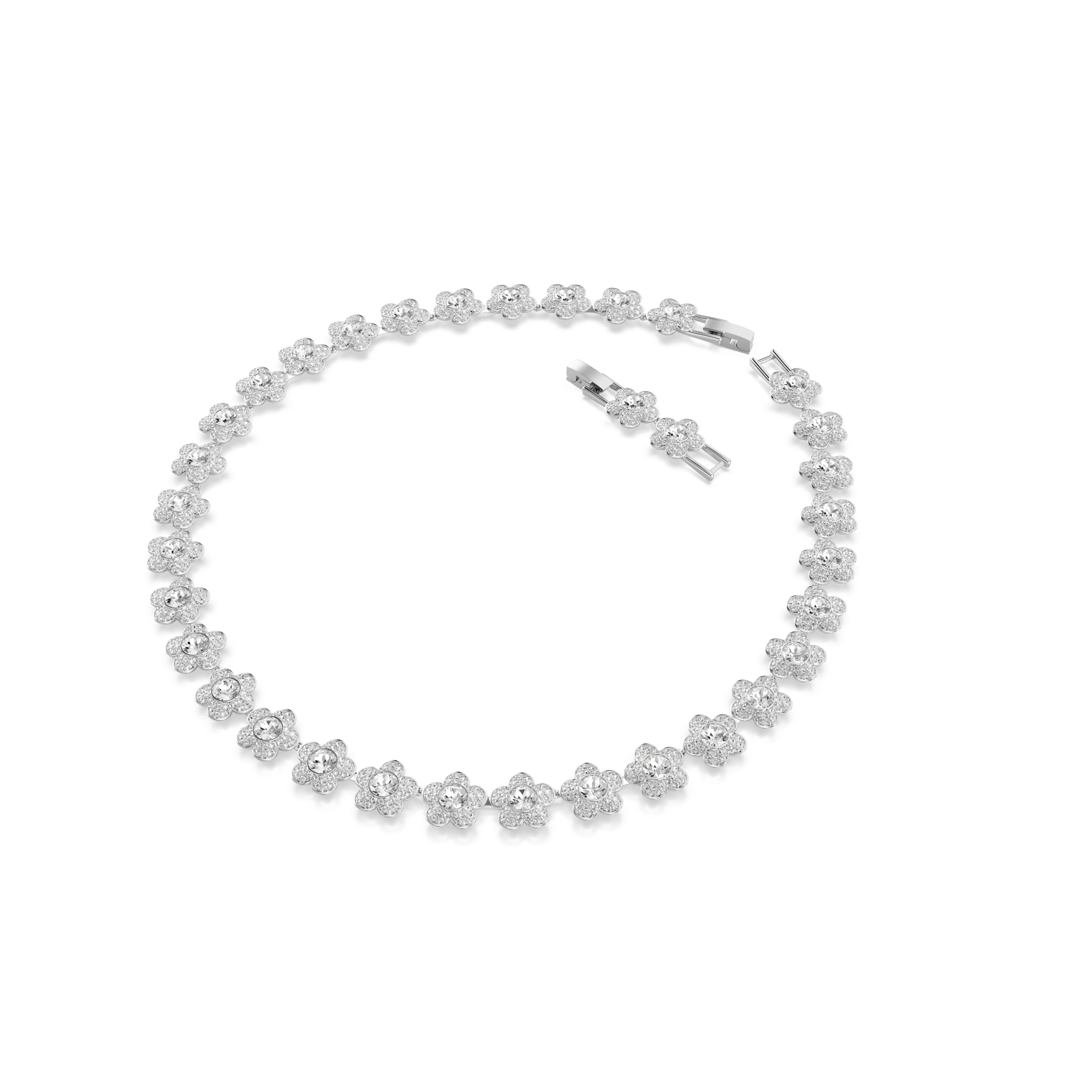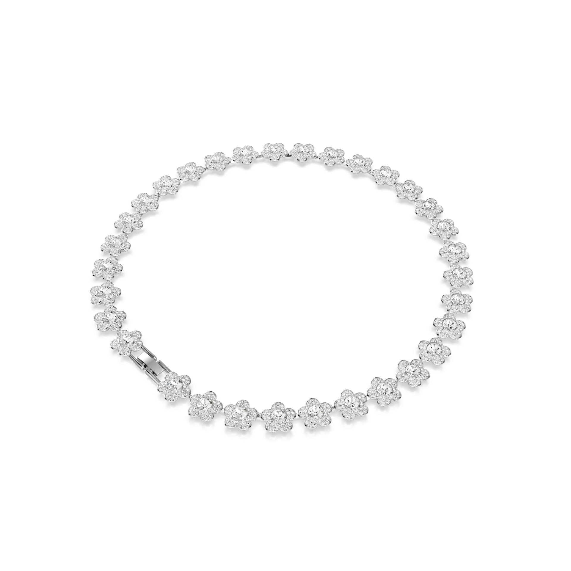 Ogrlica inspirisana lepotom prirode izrađena je sa rodijumskom završnom obradom i krasi je niz nežnih cvetova raspoređenih duž cele dužine. Svaki cvet ima kristal u sredini, dok su latice ukrašene blistavim pavé detaljima. Poput svetlucavog cvetnog lanca, ova ogrlica reflektuje svetlost na poseban način i savršeno se uklapa uz odgovarajuću narukvicu iz iste kolekcije za bezvremenski izgled.