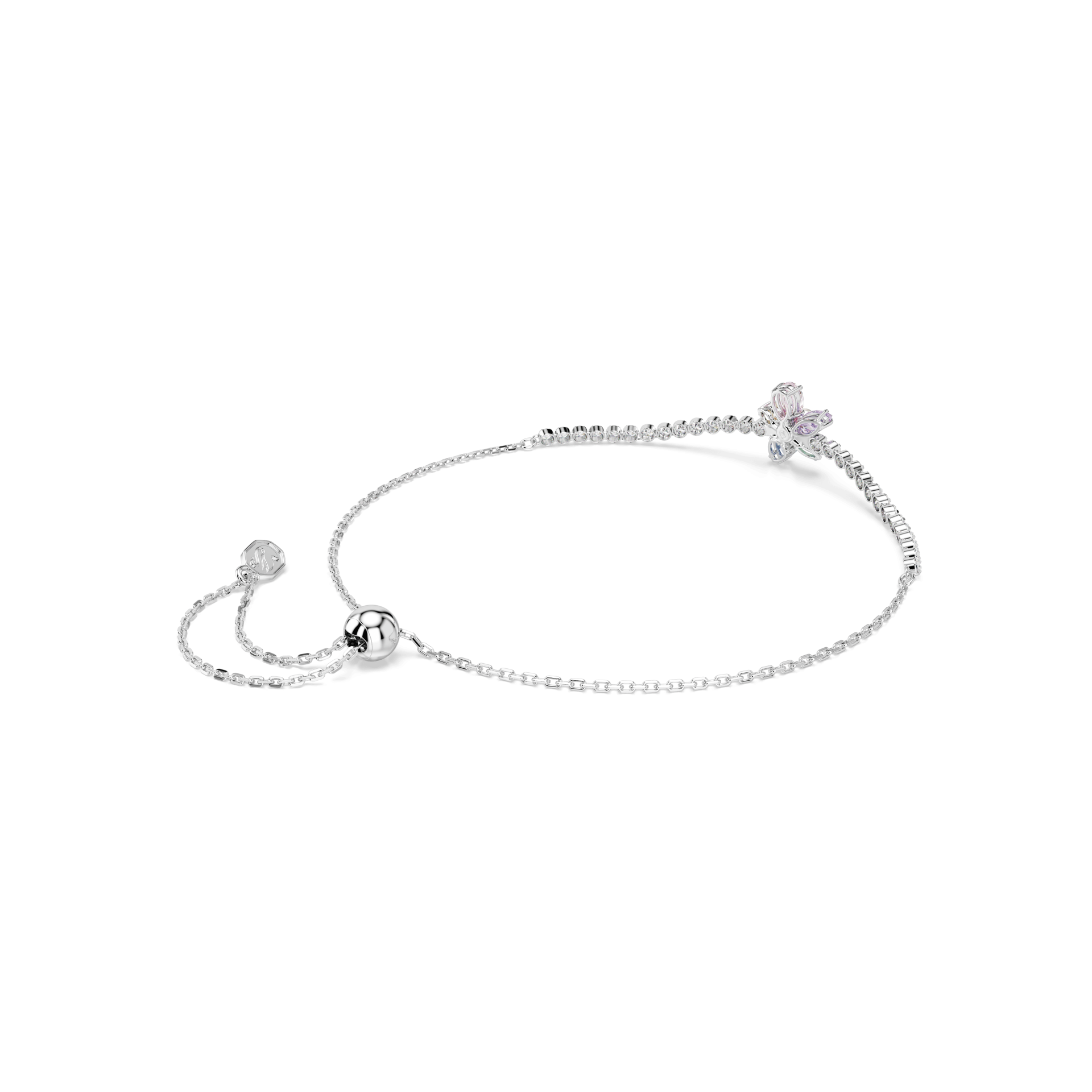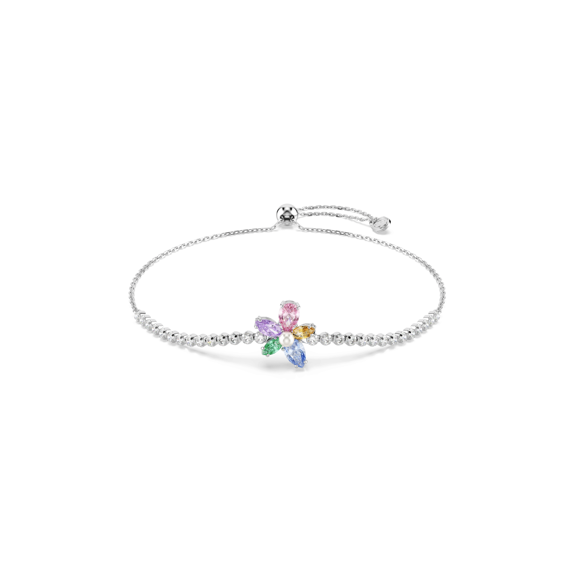 Inspirisana prirodom i oblikovana sa preciznošću, ova narukvica sa rodijumskom završnom obradom ima centralni motiv divljeg cveta, sastavljen od pet Swarovski Zirconia u različitim rezovima i bojama. U središtu se nalazi jedna Swarovski Crystal Pearl biserna kuglica, dok su oko zgloba raspoređene prozirne Swarovski Zirconia u nežnom cupchain dizajnu. Zahvaljujući kliznom zatvaranju, narukvica se lako prilagođava veličini, a savršeno se uklapa uz odgovarajući čoker iz iste kolekcije.