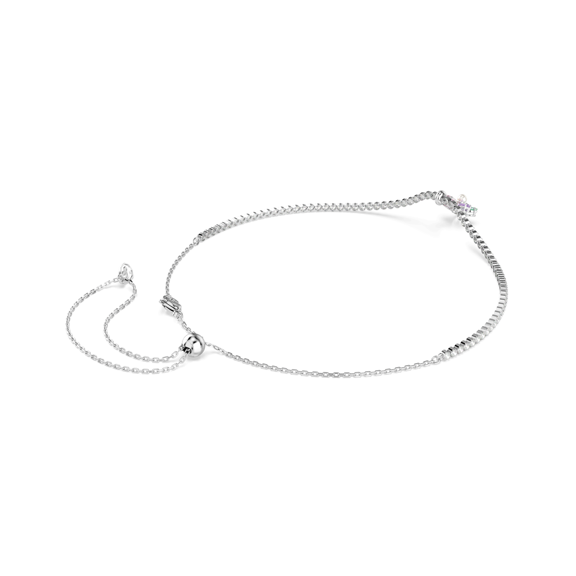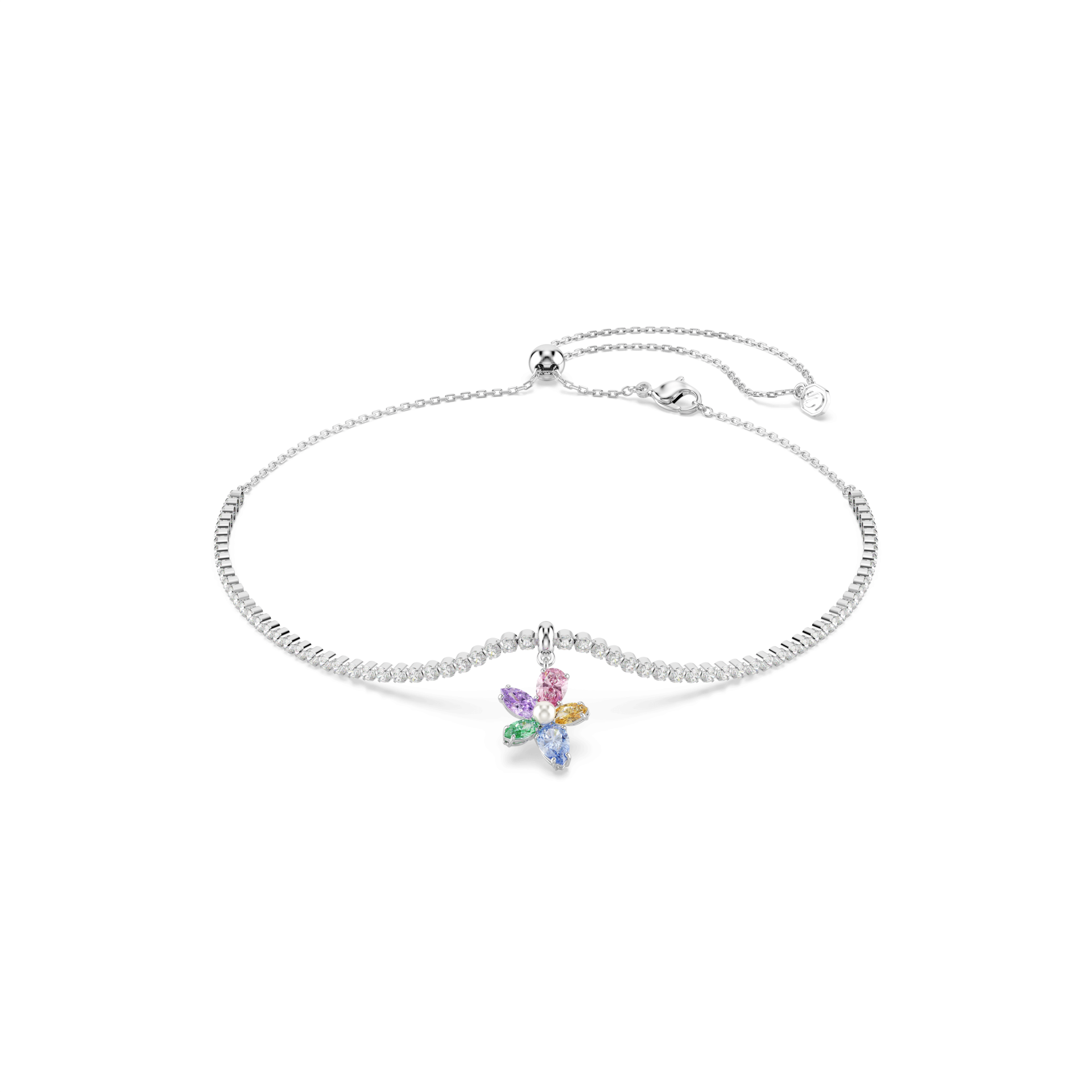 Donoseći živopisni dodir večne prirode, ovaj čoker sa rodijumskom završnom obradom ima centralni motiv divljeg cveta, sastavljen od pet Swarovski Zirconia u različitim rezovima i bojama. U središtu se nalazi jedna Swarovski Crystal Pearl biserna kuglica, dok su oko vrata raspoređene prozirne Swarovski Zirconia u nežnom cupchain dizajnu. Zahvaljujući kliznom zatvaranju, čoker se lako prilagođava veličini i savršeno se uklapa uz odgovarajuću narukvicu iz iste kolekcije.