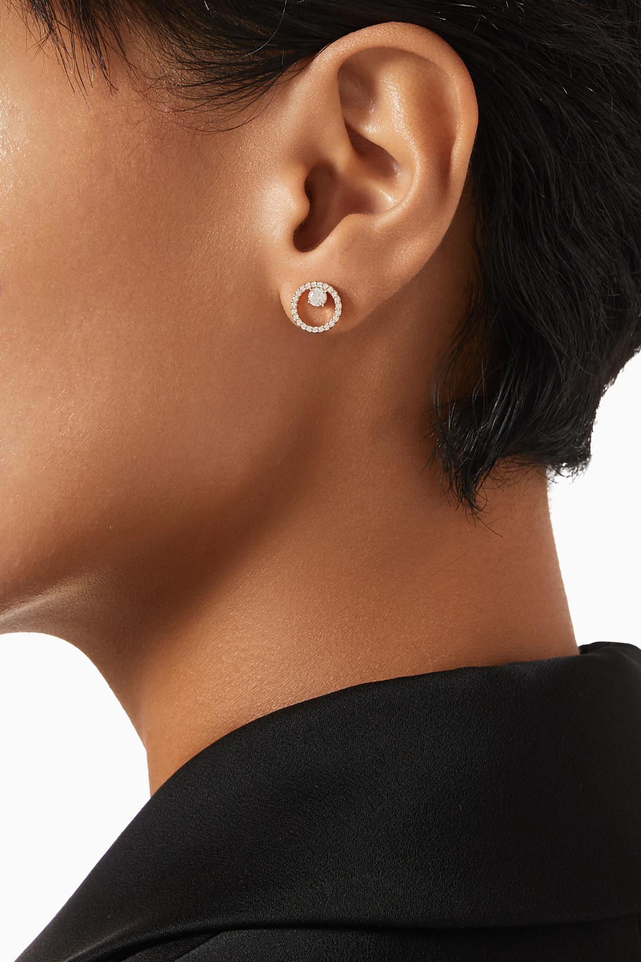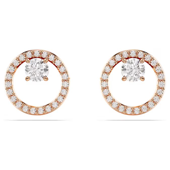 Ove rafinirane kružne minđuše (studs) odišu vanvremenskom elegancijom i suptilnim luksuzom. Izrađene sa toplom prevlakom u tonu roze zlata, svaka minđuša sadrži centralni pavé prsten od blistavih Swarovski Zirconia kamenčića, u čijem se središtu nalazi jedan veći, precizno postavljen kristal. Njihov klasičan oblik i moderan sjaj čine ih savršenim izborom za svaku priliku, a za maksimalni efekat, uparite ih sa odgovarajućim Constella ogrlicom.