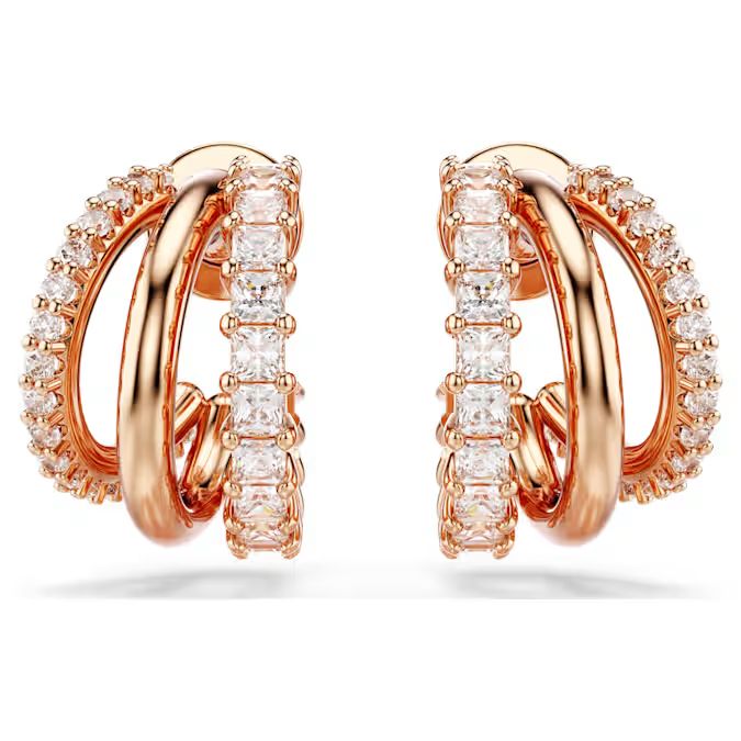 Ove pažljivo izrađene Hyperbola minđuše odišu jedinstvenom lepotom. Na svakoj strani nalaze se tri mini alke u završnici od ružičasto-zlatne legure, ukrašene Swarovski cirkonima okruglog i kvadratnog reza, postavljenim u kandžasto ležište. Kombinujte ih sa odgovarajućom narukvicom ili ogrlicom za upečatljiv, efektan izgled.