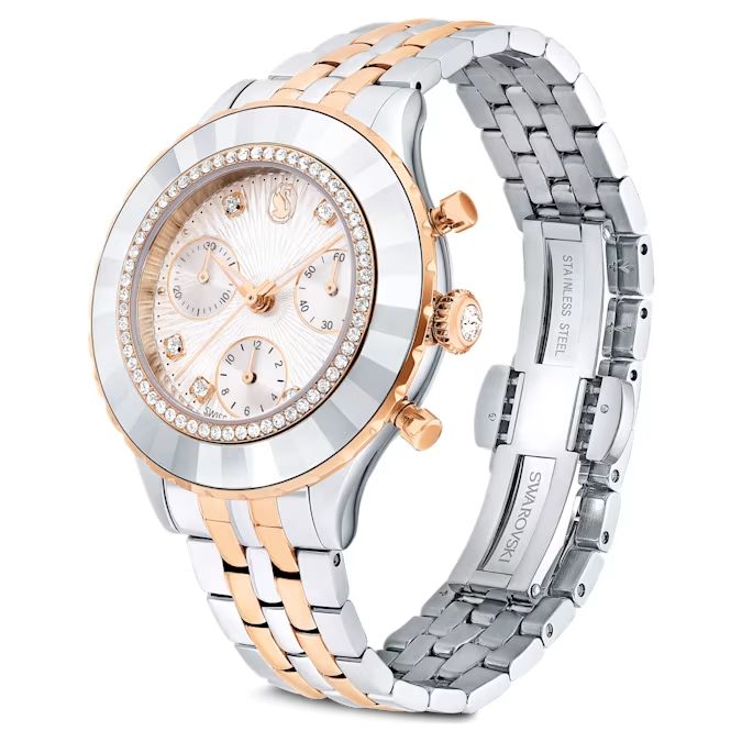 Ovaj blistavi hronograf sat predstavlja savršenu kombinaciju časovničarskog umeća i Swarovski ekspertize. Model prečnika 37 mm izrađen je od nerđajućeg čelika sa detaljima u boji roze zlata, a bezel je ukrašen kristalima, pažljivo fasetiran i okružen krugom providnog pavé. Ispod mineralnog stakla, beli guilloché brojčanik krasi logo labuda na poziciji 12 časova, kazaljke premazane LumiNova slojem i tri hronograf brojčanika za zasebno merenje sati, minuta i sekundi. Za indekse su korišćena još šest providnih kristala, dok jedan kristal krasi krunu sata. Ovaj švajcarski sat otporan je na vodu do 50 m i nosi se na bicolor narukvici sa brzim otpuštanjem.